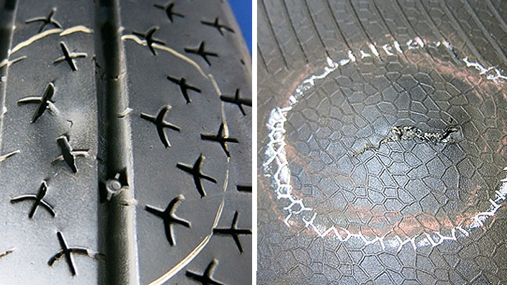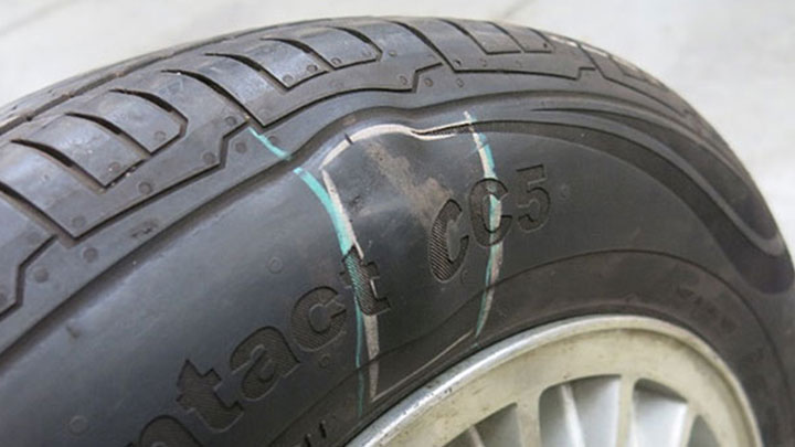胎面受到撞击,轮胎内部骨架材料损坏 (无充气状态下)。